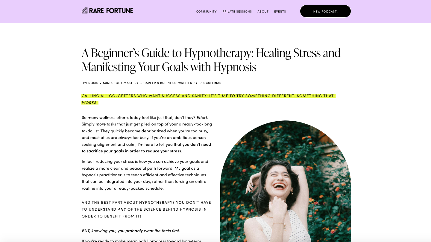 "Working with Cecilia on content for my hypnosis business was truly valuable. She quickly grasped complex subject matter and expertly integrated my wide-ranging ideas. Her excellent research skills made historical context both accurate and engaging, while her pleasant demeanor and empathetic communication made our collaboration very enjoyable. Cecilia's sharp writing brought clarity to complex concepts, and she remained receptive to feedback throughout. Her copywriting talents would be an asset to anyone in the spiritual and wellness fields seeking specialized content that requires thorough research, nuanced understanding, and a distinct voice."